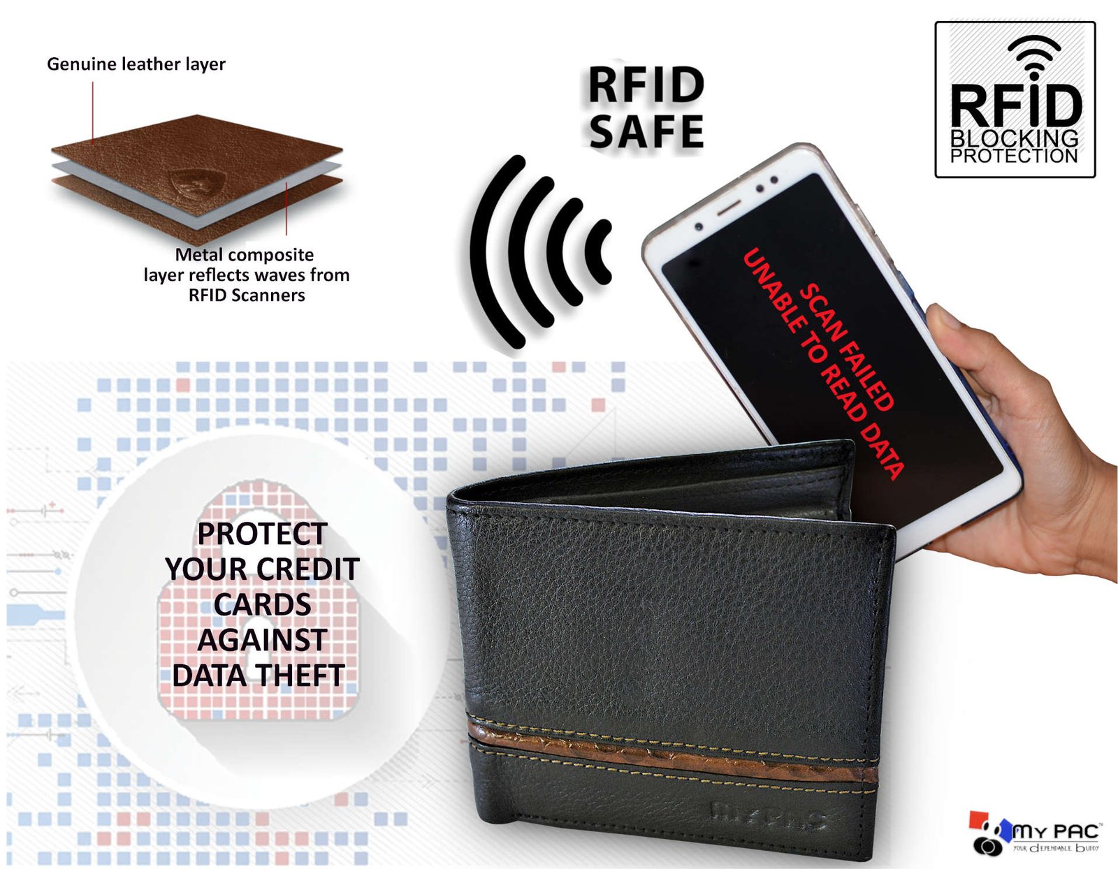 • RFID BLOCKING SECURITY: This wallet will protect unauthorised scanning of your valuable credit or debit cards by thieves that want to steal your private data. These wallets have an advanced RFID SECURE Technology, a unique metal composite sandwich layer, which block 13.5 MHz or higher RFID signals and protect your valuable information stored on RFID chips cards.