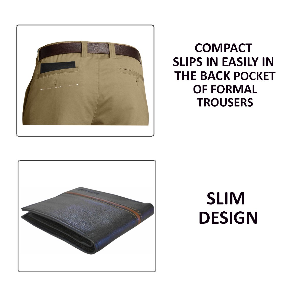 • SLIM, SLEEK & COMPACT: This wallet will slip into the back pocket of your formal trousers and not feel bulky even after you keep all your cards, credit cards and cash. This perfect sized leather wallet will seamlessly slide into your pocket.