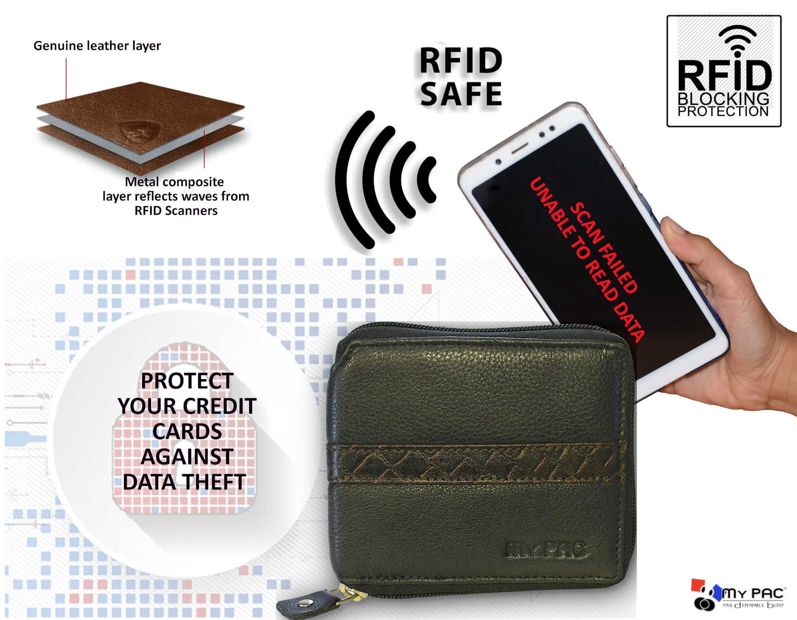 • RFID BLOCKING SECURITY: This wallet will protect unauthorised scanning of your valuable credit or debit cards by thieves that want to steal your private data. These wallets have an advanced RFID SECURE Technology, a unique metal composite sandwich layer, which block 13.5 MHz or higher RFID signals and protect your valuable information stored on RFID chips cards.